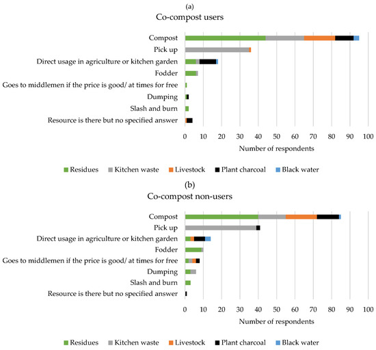 Practices in the internal resource management of (a) co-compost users and (b) co-compost non-users with N (number of respondents) = 120 (60 users and 60 non-users). Multiple answers were possible. Only data for internal use were collected for black water, which is why the collection via suction vehicles was not recorded here. “Pick up” includes collection from households and municipal collection points.