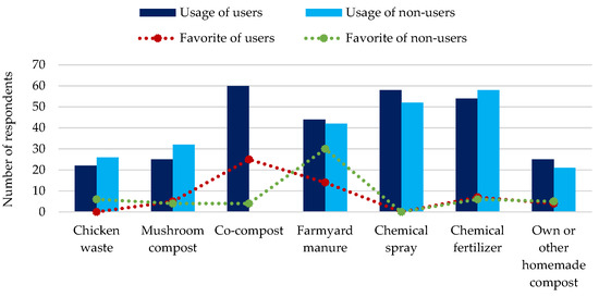 From Figure 4, it can be seen that farmers using co-compost did not renounce traditional organic and chemical fertilizers. The most popular fertilizer among users was co-compost, at 42%, followed by farmyard manure (23%) and chemical fertilizers (12%). Non-users preferred farmyard manure (50%), followed by 10%, who preferred chicken waste, and 10%, who preferred chemical fertilizer. However, the most commonly used inputs were still chemical fertilizers (used by 90% of users and 97% of non-users) and sprays (used by 97% of users and 87% of non-users). Chemical sprays in these interviews included herbicides, pesticides, and insecticides.