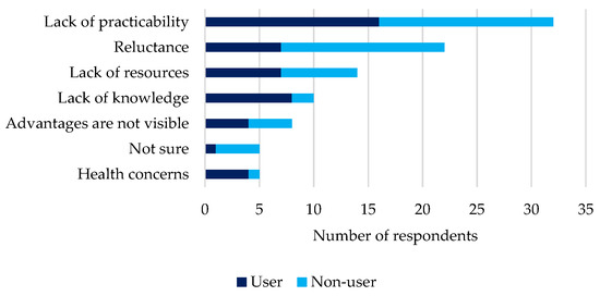 Almost all respondents used either a septic tank or a pit latrine, and only 2% used open defecation and a public toilet. Although nearly half of the respondents indicated that they would like to try a separate toilet (53% of users and 34% of non-users), reservations were expressed (visible in Figure 6). Both users and non-users initially cited a lack of practicality, options, and space (27% each). Reluctance due to personal or societal values was higher among non-compost users (25%) than among users (12%). A lack of resources such as time, money, and labor (12% each), and a lack of knowledge (13% user and 3% non-user) were also mentioned.
