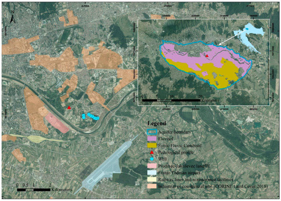 In the area of the Zagreb aquifer, several types of soil have been formed: Fluvisols, Eutric Fluvic Cambisols, Gleysols and Fluvic Phaeozems [39]. According to Ružičić et al. [40], two soils are dominant, Fluvisols and Eutric Fluvic Cambisols (Figure 1).
