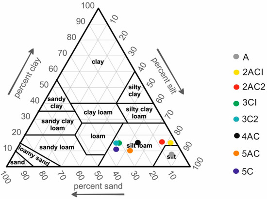 Soil texture is mainly silty loam. The highest proportion of sand is determined in 5C horizon (170–190 cm), while the smallest is in the second sampling depth (Figure 2), which is in line with the CEC values (Table 1). The smallest CEC value is determined in 3C2 horizon (100–120 cm) which is in correlation with the proportion of clay (Table 1).