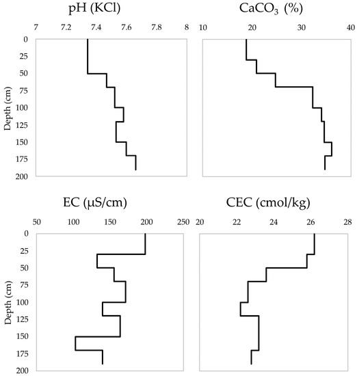 Electrical conductivity (EC) fluctuates between the horizons from 198 µS/cm in the A horizon to 140 µS/cm in 5C horizon. Ružičić et al. [63] found the same distribution of pH, CEC and EC in the previous research of Fluvisols in the Zagreb aquifer area. In some studies of Fluvisol soils [40,64], a positive correlation between EC and silty material has been pointed out. According to Officer et al. [65], soil EC in similar soils has the same distribution as CEC values through soil profile. Values of pH vary from 7.34 to 7.66. According to Ružičić and Jašaragić-Rako [66], the possible reason for pH variation along the soil profile can be associated with a change of carbonates, which, at this site, show an increase through a soil depth (Table 1, Figure 3).