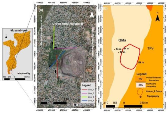 - Bernardo, B.; Candeias, C.; Rocha, F. Application of Geophysics in geo-environmental diagnosis on the surroundings of the Hulene-B waste dump, Maputo, Mozambique. J. Afr. Earth Sci. 2021, 185, 104415. [Google Scholar] [CrossRef]