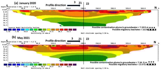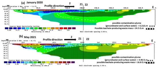 - Ugbor, C.C.; Ikwuagwu, I.E.; Ogboke, O.J. 2D inversion of electrical resistivity investigation of contaminant plume around a dumpsite near Onitsha expressway in southeastern Nigeria. Sci. Rep. 2021, 11, 1–14. [Google Scholar] [CrossRef]