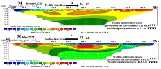 - Bichet, V.; Grisey, E.; Aleya, L. Spatial characterization of leachate plume using electrical resistivity tomography in a landfill composed of old and new cells (Belfort, France). Eng. Geol. 2016, 211, 61–73. [Google Scholar] [CrossRef]