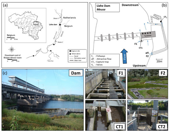 The Meuse River basin drains a catchment area of 36,000 km². The Belgian downstream part of the Meuse has an average annual discharge of 400 m3/s and is, therefore, classified as a bream fish zone [35]. This study was conducted at the first dam of the Belgian part of the Meuse (at Lixhe), 323 km upstream from the North Sea, on a non-navigable part of the river. Built in 1980, the Lixhe dam, which measures 8 m high (Figure 1), was built to facilitate navigation and to produce hydroelectricity via its four Kaplan turbines on the right bank of the river (a 23,200 kW hydroelectric plant). Since its construction, a first fishway F1 (Table 1) working at low discharge (maximum 0.3 m3/s) has been located in the middle of the dam between the turbines and the valves. F1 is equipped with a cone trap in the most upstream pool and a fine grid in the upstream slot, retaining all the fish that use it, including eels and small fish (minimum capture size: 10 mm). A second fishway F2 (Table 1) was built in 1998 to cater more specifically for the migration of large fish species such as Atlantic salmon Salmo salar and sea trout Salmo trutta. It operates at high flow (1 m3/s) and includes an attraction flow of 2.5 m3/s. F2 is located on the right bank and is equipped with a cage trap and a lift in the upper pool, which retains large fish, but not eels and small fish (minimum capture size: 150 mm).