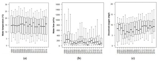 Global values per year from 1999 to 2018 of mean daily water temperature (a), mean daily water flow (b), and mean daily dissolved oxygen (c).