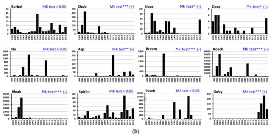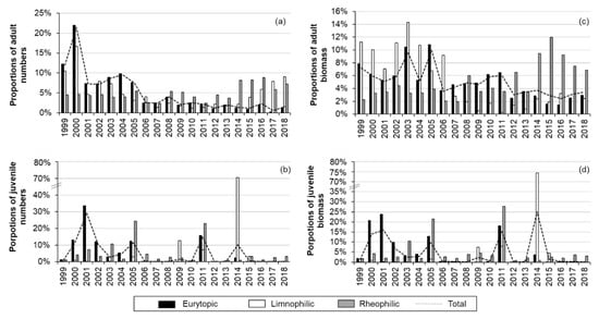 Over the 20-year period, in the case of the juvenile stage of all species, we observed a significant negative temporal trend (MK test, p < 0.001) with regard to the proportions of all individuals captured per year (tau = −0.46, p < 0.001) and for the total proportions of biomass captured per year (tau = −0.39) (Figure 3). In terms of ecological groups, there were significant negative temporal trends (MK test, p < 0.05) only for the proportions of eurytopic individuals (tau = −0.47) and eurytopic biomass (tau = −0.48). Six species showed a significant decreasing trend (MK test, p < 0.05; Figure 4b) in number over time: chub (tau = −0.62), bream (tau = −0.60), roach (tau = −0.59), bleak (tau = −0.55), dace (tau = −0.40), and nase (tau = −0.39). Two species significantly increased in number between 1999 and 2018 (MK test, p < 0.05): goby (tau = 0.64) and asp (tau = 0.50). The other four species represented in the juvenile stage (roach, ide, spirlin, barbel and perch) showed no significant temporal trend in number (MK test, p > 0.05).