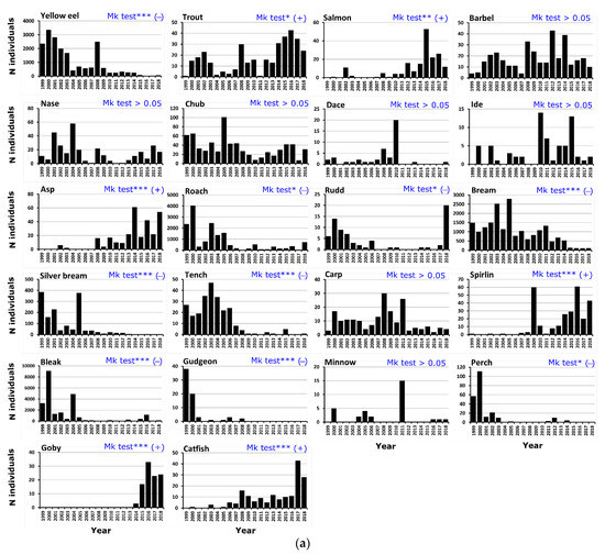 Over the 20-year period, in the case of the adult stage of all species, we observed a significant negative temporal trend with regard to the proportions of all individuals captured per year (MK test, tau = −0.72, p < 0.001) (Figure 3). In terms of ecological groups, there were significant temporal trends (negative) only for proportions of eurytopic individuals at adult stage (MK test, tau= −0.74, p < 0.001). Furthermore, in the adult stage, there were significant negative temporal trends (MK test, p < 0.05) with regard to the total biomass captured per year (tau = −0.54) and the proportions of eurytopic (tau= −0.55) and limnophilic biomass (tau = −0.54). On the other hand, we observed a significant positive temporal trend with regard to the proportion of rheophilic biomass per year (MK test, tau = 0.50, p = 0.002). The number of adults per year (Figure 4a) significantly decreased over time (MK tests, p < 0.05) for nine species: bream (tau = −0.81), yellow eel (tau = −0.74), tench (tau = −0.63), silver bream (tau = −0.62), gudgeon (tau = −0.60), bleak (tau = −0.44), perch (tau = −0.41), roach (tau = −0.41), and rudd (tau = −0.37). Conversely, we observed a significant increasing trend between 1999 and 2018 with regard to the number of adults (MK test, p < 0.05) of six species: catfish (tau = 0.70), asp (tau = 0.69), spirlin (tau = 0.67), goby (tau = 0.64), Atlantic salmon (tau = 0.62), and trout (tau = 0.41). The species showing no significant temporal trend in number in the adult stage (MK test, p > 0.05) were chub, dace, nase, carp, barbel, ide, and minnow.