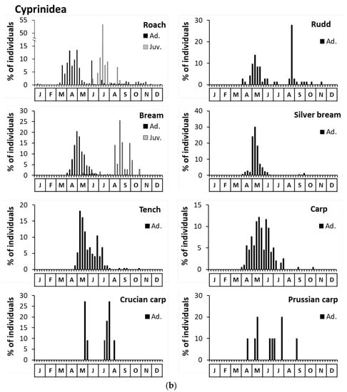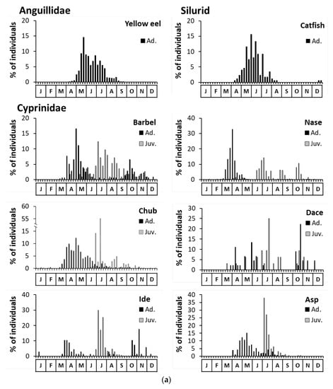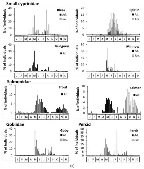 Overall capture periodicity (1999–2018) by species in terms of percentages of individuals (a) of yellow eel, catfish, and rheophilic Cyprinidae (barbel, nase, chub, dace, ide and asp), (b) of eurytopic and limnophilic Cyprinidae (roach, rudd, bream, silver bream, tench, carp, crucian carp, and Prussian carp) and (c) of small Cyprinidae (bleak, spirlin, gudgeon and minnow), Salmonidae (trout and salmon) and other families (perch for percid and goby for Gobiidae), distinguishing between adult (black) and juvenile (white) stages.