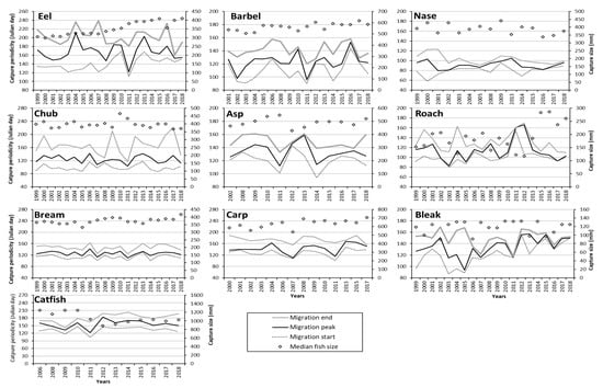 The temporal trends in migration indicators over the study period were analysed with respect to nine species in the adult stage during their spawning migration (Figure 6), reaching a minimum of five individuals over 10 years. The start migration showed a positive temporal trend only for eel (from 134th to the 152th day of the year), nase (from 78th to the 89th day of the year), and bleak (from 97th to 150th day of the year) (MK tests, p < 0.05). Bleak also showed a significant positive temporal trend of the migration peak (from 127th to 150th day of the year) (MK test, p = 0.03). These temporal trends in the timing of migration were not significantly associated with the numbers captured (linear regressions, p > 0.05), but they were associated with the mean spring temperature (linear regressions, p < 0.05) for eel (migration start) and bleak (migration peak). Other species without a significant temporal trend showed migration indicators significantly negatively related to the mean spring temperature (linear regression, p < 0.05): eel (migration peak), barbel (migration start, peak, and end), chub (migration start and peak), asp (migration start and peak), bream (migration start, peak, and end), and carp (migration start and peak). The median size of four species (eel, barbel, bream, and carp) exhibited a significant positive temporal evolution (MK test, p < 0.05), with increases ranging from 46 mm (barbel) to 113 mm (carp). The increase in size of eel and bream were significantly associated with decreased numbers of annual captures (Table 5).