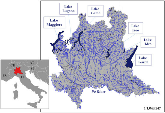 Lombardy (23,864 km2 area) is well suited for this kind of investigation due to its richness in freshwaters (Figure 1). For instance, six relatively large (up to 370 km2) lakes, mainly of glacial origin, characterize the landscape in the northern area of the region. Additionally, the hydrographic network is extremely heterogeneous, ranging from small Alpine streams to large lowland rivers draining into the Po River (i.e., the longest Italian River, marking the southern border of the region) [18,19].