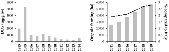 Trend of DDx (concentrations are expressed on lipid weight-lw) from 1985 to 2014 in Lake Como shad Alosa agone (modified from [21,22]) (left). Total area (hectares) of organic farming in Lombardy, and the percentage compared to Italy (data from [25,26,27,28,29]) (right).