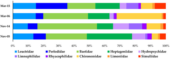 Relative abundance of the main 10 families of benthic macroinvertebrates collected in the Roasco Stream before and after the implementation of minimum flows and controlled sediment flushing operations (data from [23,24]). Plecoptera families are blue-colored, Ephemeroptera are green-colored, Trichoptera are purple-colored and Diptera are orange-colored.