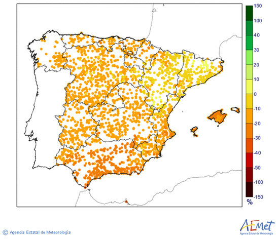 Evolution of the precipitations in the Iberian Peninsula for the horizon 2081–2100 (RCP 8.5. Annual). Source: AEMET [65]. Note: map elaborated in accordance with the models of the Fifth Report of the IPCC.