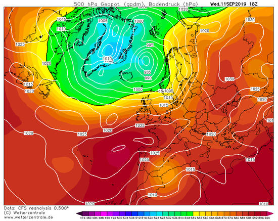 Atmospheric situation causing the cold front of 11th September 2019, with floods in the south-eastern part of the Iberian Peninsula. Source: Wetterzentrale [67].