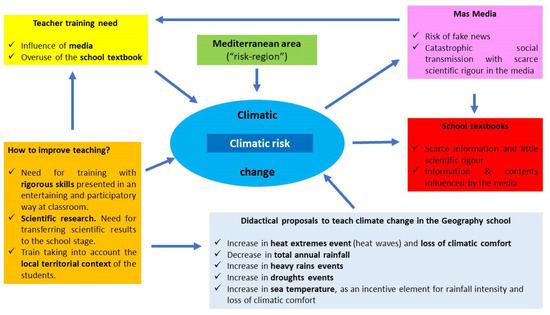 In order to teach about climate hazards at classroom, it is important to highlight the atmospheric processes that have been taking place in recent decades on the Mediterranean coast. The activities proposed in this study seek to present the reality of the data that substantiate these processes and compare their presentation with the information provided in the school textbooks and the media in order to identify successes and errors. The overall aim is to provide a series of simple proposals for teaching weather extremes in the classroom [73]. These proposals are supported by the data and the rigour of the analyses and the research carried out by the geographic discipline in the fields of Climatology and Hydrography, or the territorial analysis of processes. Figure 7 analyses the fundamental aspects to be addressed at classroom.