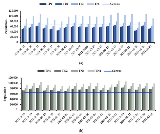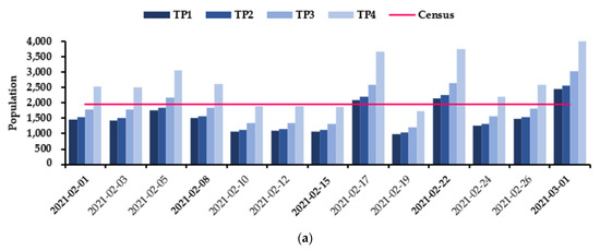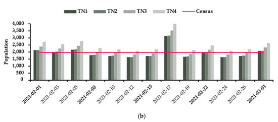 Even though population size cannot be predicted with a high level of confidence, the goal of assessing an estimated population based on different estimations is to better reflect the influence that population changes have on the detected signals of SARS-CoV-2 in wastewater [12,44,45], and thus, the implications for public health decision-makers. The estimations of population size described in Section 3.1 were applied to further normalize the viral loads (Section 3.4.1) in order to include the effect of population dynamics on SARS-CoV-2 wastewater data (Figure 4a,b). SARS-CoV-2 normalized to census data is the same as viral load, since census data are constant. However, for comparison of population normalization procedures, this is included in Figure 4a,b.