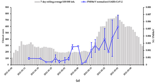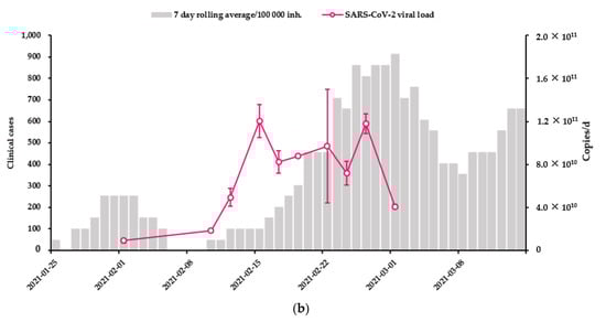 The sampling period covers an initial period of low clinical case numbers (282 and 0 clinical cases per 100,000 inhabitants (inh.) per week at the UDD and RAN WWTPs, respectively), followed by an increase to a maximum of 787 clinical cases/100,000 inh. at the UDD WWTP and 913 clinical cases/100,000 inh. at the RAN WWTP per week (see Supplementary Materials Figure S1a,b).