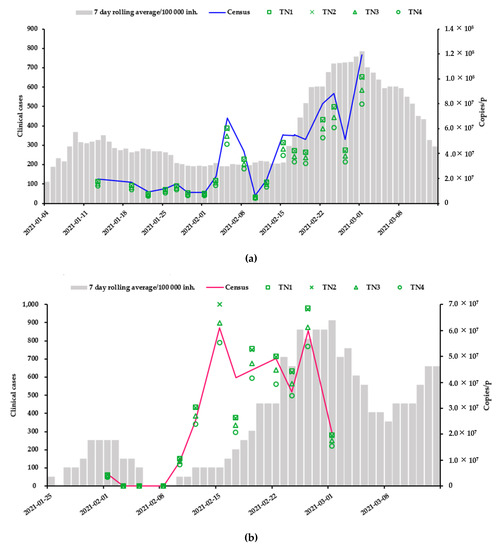 Longitudinal data of SARS-CoV-2 viral loads (copies/d) normalized to census population (census) and TN estimated population size (TN1-TN4 benchmarked with daily new clinical cases per 100,000 inh. based on day of testing at (a) UDD WWTP and (b) RAN WWTP (note: the date identified is the first Monday of every week).