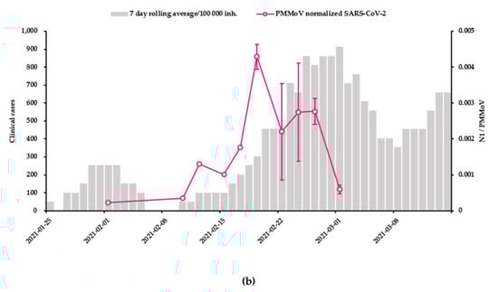 When examining the effect of PMMoV normalization on the longitudinal data sets, a temporal trend comparable to SARS-CoV-2 normalized to WWTP flow and population can be seen at both WWTPs (Figure 5a,b). When compared to flow-normalized SARS-CoV-2, the magnitude of the normalized data using this approach more accurately reflects the number of clinical cases/100,000 inh. at the two WWTPs in a manner similar to population normalization. Comparing viral loads normalized to population or PMMoV with clinical cases indicates that the temporal variations follow the same pattern as the viral loads (Figure 3a,b). Moreover, after the first peak (between 8 and 10 February) in normalized SARS-CoV-2 data at the UDD WWTP, both the population- and PMMoV-normalized data sets showed a decline in normalized SARS-CoV-2 data in the same way as WWTP flow normalized data. The normalized data could decrease if the population of the area suddenly increased while infection rates remained unchanged. However, no such relationship could be found in this study based on population estimates at the time (Figure 1a,b).