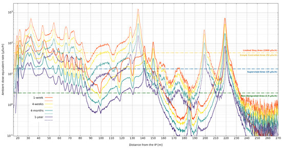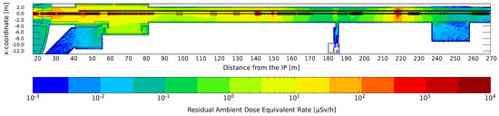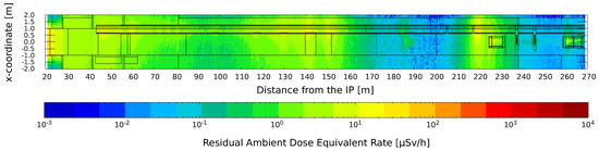 The cryogenic distribution line (QRL) provides liquid helium (1.9 K) to the cooling loops of the magnet cryostats and other cryogenic elements in the LHC [14]. During LS3 more than 800 m of QRL will be removed in LSS1 and LSS5 to be upgraded to new HL-LHC QXL. The upgrade will begin only after the dismantle and extraction of the main beamline elements (magnets, collimators, absorbers). FLUKA simulations allowed determining the radiation environment in the LSS when the beamline elements are completely removed (Figure 3). Compared to Figure 1 the radiation levels in the tunnel are significantly lower, showing a peak residual dose rate of 40–50 μSv/h (∼220 m from IP) and an average <10 μSv/h in contact with the QRL. It is important to underline that despite the absolute average dose rate is relatively low, the intervention will last several weeks with several workers/teams involved potentially leading to significant integrated individual/collective dose that must be accurately evaluated based in the detailed intervention procedure (called “Work Dose Planning”, WDP, in CERN jargon). In addition to the external exposure, the risk of possible internal contamination shall be considered by taking into account the cutting technique (different options currently under discussion). Further studies need to be performed to evaluate other constrains allowing to reduce the exposure/contamination risk when the details of the intervention will be finalized.
