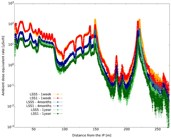 The radiation levels during LS3, in the so-called LHC Long Straight Section (LSS) of Point 1 and Point 5, have been estimated by FLUKA simulations [12]. The LHC has 8 straight sections (in opposition to the bended part of the tunnel infrastructure, the so-called “arc”) which serve as experimental or utility insertions. There are two high-luminosity experimental insertions located at Point 1 (ATLAS) and 5 (CMS) and two more experimental insertions at Point 2 (ALICE) and 8 (LHCb), which also contain the injection systems. The beams only cross at these four locations, being the experiment insertions, and are focused onto the interaction point by superconducting low-beta triplets (quadrupoles). Insertions 3 and 7 each contain the collimation systems, momentum and beta-cleaning, respectively. Insertion 4 hosts the RF system while insertion 6 contains the beam dumping system [13]. In the following, LSS1 and LSS5 will be described more in details being the main topic of this section. The simulations considered the combined operation of the LHC from the beginning of Run 1 (2010) to the end of Run 3 (2025). The irradiation profile used in the computation was produced from the luminosity data as recorded by the ATLAS and CMS experiment in Run 1 and Run 2. In addition, assumptions on Run 3 operation have been made based on data provided by the LHC operation team. Figure 1 shows a typical 2D map of the radiation levels in LSS1. These maps are produced for different cooling times ranging from a few hours to a few years after beam stop: these key cooling times provide the radiological environment relevant for different steps of the LS3 upgrade works. The map shows only half of the LSS (∼270 m, right side Point 1) since the radiation levels are approximately symmetric with respect to the Interaction Point (IP). The main hot spots are visible at the main beam line elements such as (from left to right of Figure 1) the Inner Triplet quadrupoles (IT, 20–50 m from IP), the separation dipole D1 (six modules, 60–85 m), the neutral absorber TAN (140 m), the beam 2 tertiary collimators (TCT, 145 m) and the beam 1 luminosity debris collimator (TCL4 150 m, TCL5 185 m, TCL6 220 m). Figure 2 shows the residual ambient dose equivalent rate profiles in LSS1 and LSS5: while for the large fraction of the LSS the profiles show similar results, differences are observable at the level of the TCL4 mainly due to the different crossing scheme at the IP (IP1 vertical crossing, IP5 horizontal crossing).
