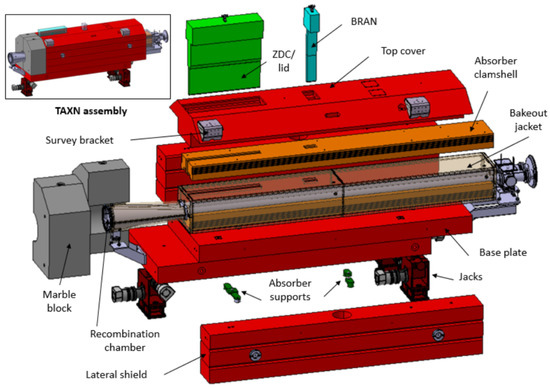 The Target Absorber Neutrals (TAN) is the component in the LHC LSS where the two proton/ion beams are recombined in a common vacuum chamber and it provides the necessary protection to the downstream superconducting magnets of the Matching Section (Q4 to Q7) in order to avoid quenching. Indeed, the TAN is designed to absorb the flux of forward high-energy neutral particles produced at the interaction point while allowing for enough aperture to reach the optic goals (larger crossing angle and beam size) [13]. The increasing particle debris from LHC to HL-LHC will require a new design of the TAN, called TAXN (HL-LHC Target Absorber Neutrals), capable to withstand with the higher beam conditions. The TAN/TAXN (Figure 4) share a very similar mechanical layout and are mainly composed by a copper absorber, a steel (ASTM A36) and a marble shielding and a recombination chamber (“Y-chamber”). In total, four TAN (2× LSS1 and 2× LSS5) will be dismantled from the LHC and replaced/upgraded during LS3.
