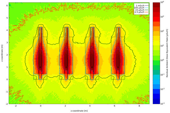 Secondly, FLUKA was coupled with SESAME to simulate the storage, dismantling and upgrade of the TANs. The global dose field due to the presence of all four TAN in the same environment is shown in Figure 5. Isodose lines at 2.5, 15, 100 and 1000 Sv/h are highlighted in Figure 5: it is possible to observe that the iso-dose line at 100 Sv/h is fully included within the TAN shielding, i.e., <100 Sv/h are expected in contact with the TAN fully assembled.