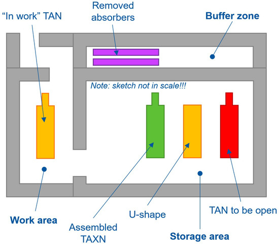 The dismantling and upgrading of the TAN was divided in two major steps, studied via SESAME-FLUKA simulations. The first configuration considered the TAN without the top shielding and the forward physics detector (ZDC/BRAN). The second configuration refers to the machining of the remaining lateral/bottom TAN shielding (so-called “U-shape”). All the above estimates allow for an optimized (ALARA) planning of the upgrade activities. In addition, some preliminary considerations on the worksite layout can be made by planning for a dedicated area for the storage of the TANs, a workspace for machining/upgrading the TAN and a buffer zone for radioactive waste (accessible via a crane) Figure 6. The worksite layout shall account for a dedicated shielding which will be designed based to cope with the radiological classification of the surrounding area/building.