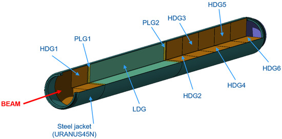 The LHC beam dump (TDE) allows for absorbing the 7 TeV proton beam in a controlled manner. Two TDE are present in the LHC machine layout, one for each beam. The TDE are installed in two dedicated galleries (called UD62/UD86), ∼750 m downstream the IP6. The TDE is made of different blocks of graphite (Figure 7) with different densities: 1710 × 2 mm thickness sheets of low-density graphite (Sigraflex, LDG = 1.1–1.2 g/cm) and 5 × 700 mm in diameter blocks of High-density graphite (Sigrafine, HDG = ∼1.77 g/cm). The graphite is contained in a 318LN (URANUS 45N) steel vessel and the full assembly is surrounded by a shielding made of iron and concrete to reduce the residual radiation levels during interventions in the UD galleries [13].