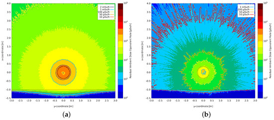 2D maps of the ambient dose equivalent rate during different steps of the LHC TDE post-irradiation examination (∼3 years cool down after end of Run 2 proton-proton operation). (a) pre-autopsy configuration (full TDE assembly); (b) final configuration (LDG fully exposed).