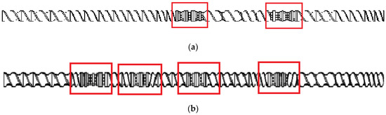 Scheme of the plasticizing system: (a) configuration 1 (two kneading and mixing zones); (b) configuration 2 (four kneading and mixing zones). The kneading and mixing zones are marked.