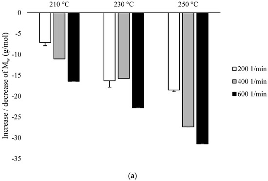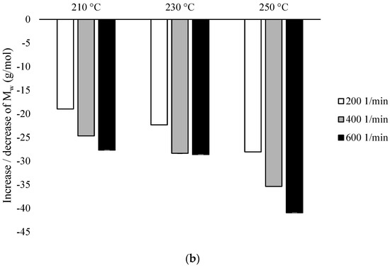 The particular importance of the screw rotational speed was found for the temperatures of 210 °C and 250 °C, although it can be generally assumed that Mw is inversely proportional to the increase in the rotational speed of the screw and the processing temperature (Figure 3).