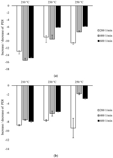 For configuration 1, the lowest PDI values were recorded for samples extruded at the lowest temperature (210 °C), while for samples extruded at a rotational speed of 200 min−1, PDI was 13% lower than for non-extruded PLA. At the temperature of 210 °C, a slightly greater decrease in the parameter was noted with the increase in the speed of rotation, but the difference between the values for 400 min−1 and 600 min−1 was similar. At 230 °C, for samples processed at the rotational speed of 200 min−1 and 400 min−1, PDI was reduced by about 9%, while for the speed of 600 min−1 by about 6%. The further increase in temperature did not affect the values mentioned. At the processing temperature of 250 °C, similar PDI values were shown for the individual screw speed values as at the temperature of 230 °C (Figure 4a).