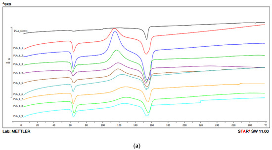Tm from the second heating for samples obtained with configuration 1 ranged from 149.2 °C (PLA extruded at 230 °C, 600 min−1 screw revolutions) to 157.2 °C (PLA with the highest processing conditions—250 °C, 600 min−1) (Figure 6, Table 2a).