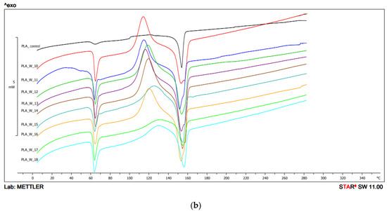 DSC thermograms heating analysis 1: (a) configuration 1; (b) configuration 2. Abbreviations: PLA 1—configuration 1, 210 °C/200 min−1; PLA 2—configuration 1, 210 °C/400 min−1; PLA 3—configuration 1, 210 °C/600 min−1; PLA 4—configuration 1, 230 °C/200 min−1; PLA 5—configuration 1, 230 °C/400 min−1; PLA 6—configuration 1, 230 °C/600 min−1; PLA 7—configuration 1, 250 °C/200 min−1; PLA 8—configuration 1, 250 °C/400 min−1; PLA 9—configuration 1, 250 °C/600 min−1; PLA 10—configuration 2, 210 °C/200 min−1; PLA 11—configuration 2, 210 °C/400 min−1; PLA 12—configuration 2, 210 °C/600 min−1; PLA 13—configuration 2, 230 °C/200 min−1; PLA 14—configuration 2, 230 °C/400 min−1; PLA 15—configuration 2, 230 °C/600 min−1; PLA 16—configuration 2, 250 °C/200 min−1; PLA 17—configuration 2, 250 °C/400 min−1; PLA 18—configuration 2, 250 °C/600 min−1.
