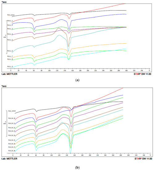 The lowest Tcc value was observed for the sample extruded at the temperature of 230 °C with the screw speed rotation 600 min−1 (127 °C), the highest for the sample extruded under the lowest conditions—temperature 210 °C, screw speed rotation 200 min−1 (129.4 °C). Tcc was not observed for the samples 210 °C/400 min−1 and 600 min−1; 230 °C/400 min−1 and for unprocessed PLA (Figure 6, Table 2b).