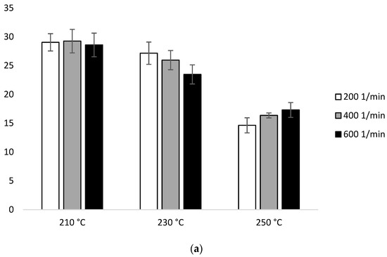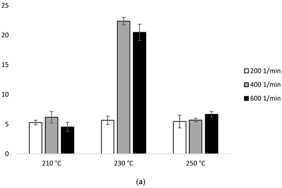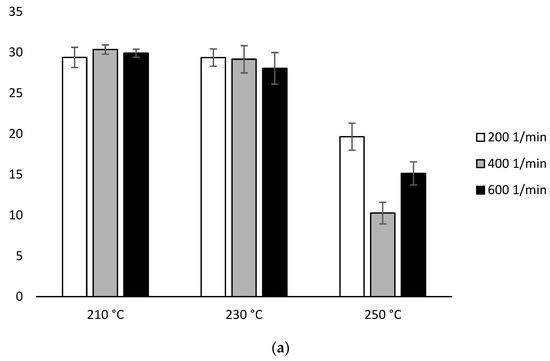 With the participation of configuration 1, the lowest MFR value (increase by about 14% in relation to PLA not subjected to the extrusion process) was obtained after extrusion at the lowest temperature (210 °C) at the lowest of the applied rotational speeds (200 min−1). The highest MFR value (increase by over 250% in relation to PLA not subjected to the extrusion process) was obtained after extrusion at the highest temperature (250 °C) at the highest of the applied rotational speeds (600 min−1) (Figure 2a). For each of the temperatures, an increase in the MFR value was observed proportional to the increase in the rotational speed of the screw. The MFR value at individual rotational speeds of the screw increased with the temperature (Figure 2).