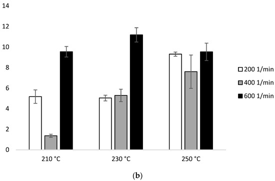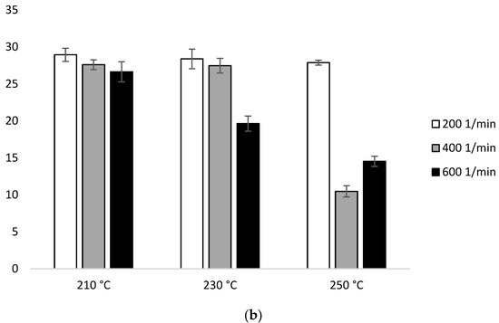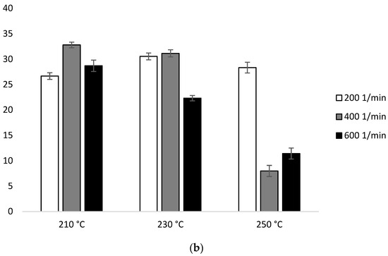 In the second heating scan, configuration 1, the ΔHm values are in the range of 4.54 J/g (210 °C/600 min−1)–6.66 J/g (250 °C/600 min−1). The exception are two samples extruded at 230 °C, which resulted in ΔHm 22.36 J/g (400 min−1) and 20.46 J/g (600 min−1) (Figure 9a, Table 2a).