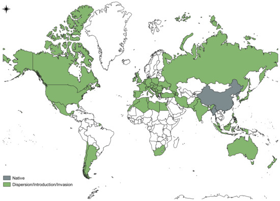 Countries where A. altissima has been reported as an introduced, naturalized, and invasive species (adapted from [27,28,29,30,31,32,33]).