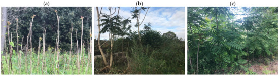 - Burch, P.L.; Zedaker, S.M. Removing the invasive tree Ailanthus altissima and restoring natural cover. Arboric. Urban For. 2003, 29, 18–24. [Google Scholar] [CrossRef]