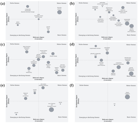 Distribution of thematic areas for each set of keywords used in the search in the Web of Science database and which were processed in the Bibliometrix package (Biblioshiny routine) in RStudio: (a) set of keywords “Ailanthus” and “altissima”; (b) “ailanthone”; (c) set of keywords “Ailanthus” and “altissima” and “ecosystem” and “impacts”; (d) set of keywords “Ailanthus” and “altissima” and “invasive” and “behavior”; (e) set of keywords “Ailanthus” and “altissima” and “allelopathy”; and (f) set of keywords “Ailanthus” and “altissima” and “control” and “actions”.