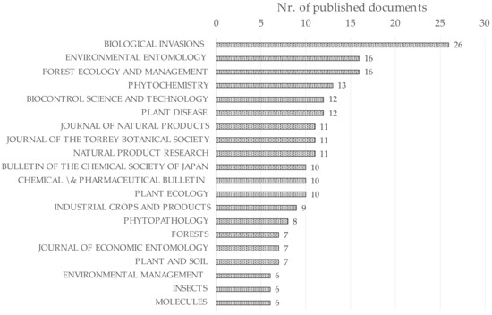 Concerning sources, Figure 4 shows the list of the most relevant journals that contribute the larger number of documents. As can be seen, the journals dedicated to the themes of biological invasions, ecological aspects and phytochemistry are the ones that contribute the most with documents on the broader topic with the set of keywords “Ailanthus” and “altissima”.