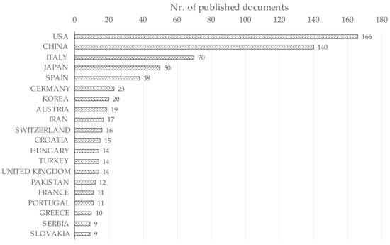 Concerning the origin of documents, as shown in Figure 5, the countries that originated the most were the USA and China, with, respectively, 166 and 140 documents leading the way in the study of the topic A. altissima. One second group of countries appears, including Italy, Japan, Spain, Germany, and Korea. As can be inferred, the interests of this group of countries are different. On the one hand, there are the countries where the species originates, such as China and Korea, where studies essentially address the ecological aspects of the species and the importance of the constituent compounds. On the other hand, countries such as the USA, Germany, Italy, or Spain, where the species is considered invasive and where studies essentially address issues related to its control and eradication, impacts on ecosystems and models of dispersion of the species.