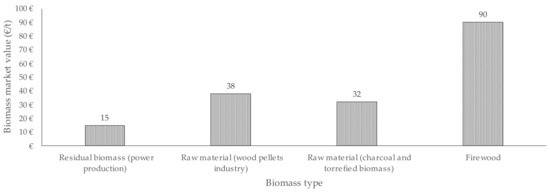 Thus, due to the values presented for the analyzed parameters and the comparison with the limit values presented and allowed by the ENPlus® standard, it is not feasible to use energy through the incorporation of A. altissima biomass in the production of wood pellets, mainly if these are intentionally produced to be certified. However, as shown in other studies with species that also presented parameters with values outside the permitted limits, these biomasses can be incorporated into mixtures with good quality raw materials [106,107,109,110,111]. These values are diluted and maintained the final product within the quality parameters. Nevertheless, although this possibility may allow the creation of a value chain for this species, its use both in wood pellets and in large-scale industrial uses must be restrained, given the risks associated with the corrosive effects already described. The only possibility for the energy recovery of A. altissima high seems to be either the production of non-certified wood pellets, intended for use in the domestic market, in non-regular and infrequent consumers, or in the production of firewood for domestic fireplaces, also in non-regular and infrequent consumers, which in this way create a value chain, but without the risk of corrosive effects on the equipment, since these would be uses with less fuel and less frequent and regular. However, the pelletizing of these biomasses can open another possibility of valorization using these wood pellets, for example, for animal bedding. Figure 6 presents the average market price for the most common types of these biomasses, according with the potential destinations and processing uses. The market value of these biomasses is directly related to the diameter of the materials available. In this way, small-diameter bushy type biomass, is considered residual and preferentially used in the production of electrical and thermal energy directly in combustion processes. Medium diameter biomasses (15 to 25 cm) are commonly used in wood pellets and charcoal production, while diameters bigger than 25 cm are more commonly used in firewood.