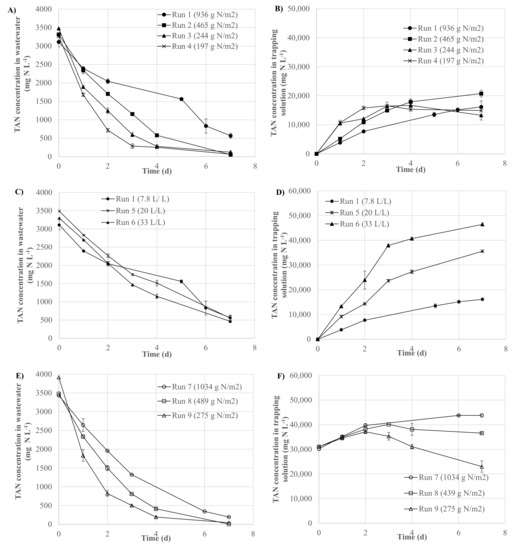 Variation of TAN concentrations in the synthetic wastewater and in the acidic trapping solution for the nine experiments performed: (A) Evolution of TAN concentration in wastewater for Runs 1–4; (B) Evolution of TAN concentration in the acidic trapping solution in Runs 1–4; (C) Evolution of TAN concentration in wastewater for Runs 1, 5 and 6; (D) Evolution of TAN concentration in the acidic trapping solution in Runs 1, 5 and 6; (E) Evolution of TAN concentration in wastewater for Runs 7–9 and (F) Evolution of TAN concentration in the acidic trapping solution in Runs 7–9.