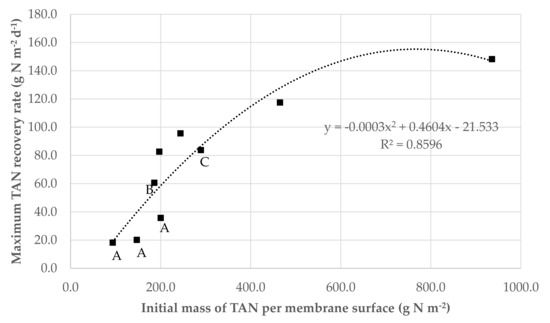 Maximum recovery rates in the literature studies and in the present study using GPM technology for N recovery vs. the ratio of initial mass of TAN in wastewater per membrane surface. A second order equation and R2 are represented: (A) García-González and Vanotti [15]; (B) García-González et al. [14]; (C) García-González et al. [24]. Values of the present study are presented as symbols without letters.