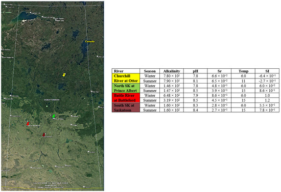 The results of in-stream water quality analyses indicate that the Churchill River, flowing over bedrock low in calcium and magnesium, has a negative CCPP in winter that is even more pronounced than in summer. The water chemistry reflects the chemistry of its surrounding and contact environments. As such, it has the potential to retain a higher concentration of dissolved strontium in the aqueous phase and thus distribute it over a longer time and distance. The North Saskatchewan River has a low CCPP and demonstrates greater stability in winter than in summer, as evidenced by the near-equilibrium alkalinity measured in situ. There, CCPP and SrPP are very low, indicating the stability of strontium concentrations. In the North Saskatchewan River, it is anticipated that dissolved strontium will remain in the water, allowing for transportation across longer periods of time and distance. In summer, the CCPP and SrPP are slightly higher in the North Saskatchewan River, indicating that the concentration of dissolved strontium will be slightly reduced. The South Saskatchewan River and Battle River have significant precipitation potential for both CCPP and SrPP and for both summer and winter.
