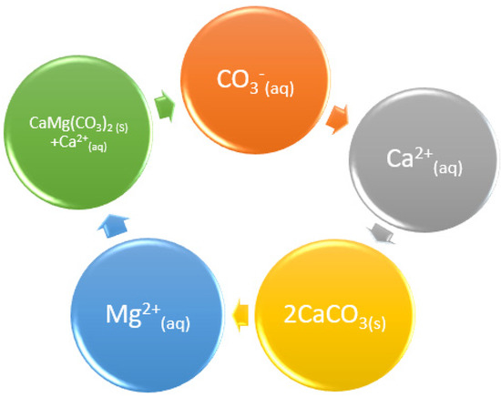 The XPS analysis indicated magnesium on the precipitates, along with calcium. Since the precipitation of calcium is initiated by calcium carbonate precipitation, followed by calcite precipitates and then dolomite, it is assumed that an equal amount of alkalinity is consumed in calcite and dolomite precipitation. In the continuity of precipitation reactions, the formation of dolomite and calcite reached equilibrium, where dissociation and precipitation occurred equally and simultaneously, as per the cycle in